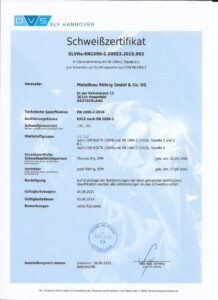 Unsere Zertifikate bestätigen, dass unsere Schweißer und Metallbauer regelmäßig geschult und nach anerkannten Verfahren geprüft werden.